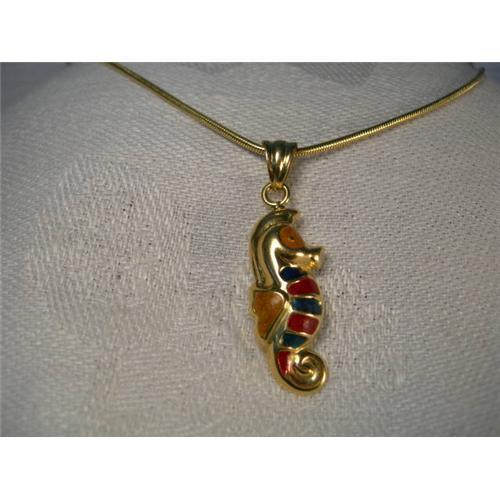 You are looking at a lovely estate 14K yellow gold enameled seahorse pendant. The pendant measures 1.25 inches long by almost 1/2 of an inch wide. It weighs 2.5 grams. It is in mint condition.
