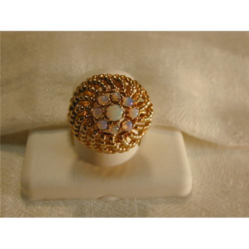 You are looking at an estate 14K yellow gold opal sphere ring. There are 9 genuine opals in this great piece. The sphere measures almost 7/8 of an inch in diameter and is 3/4 of an inch high. This ring is a size 7.25. Sizing is available. It weighs 10.1 grams. It is in mint condition.