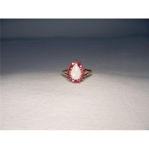 <tr><td>Title:Estate 14K YG Gold Filigree Ruby Pear Opal Ring</td></tr>