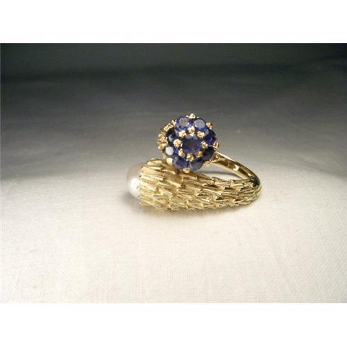 You are looking at a unique estate 14K yellow gold sapphire and pearl ring. There are 8 genuine sapphires measuring 3 mm in diameter and another genuine sapphire that measures 4 mm in diameter. The cultured pearl measures 8 mm in diameter. The top of the ring measures 1 inch long by 3/4 of an inch wide by 1/2 of an inch high. This ring is a size 6. Sizing is available. It weighs 12.8 grams. It is in mint condition.
