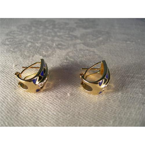 You are looking at a pair of 14K yellow gold diamond earrings with lapis and onyx. Each earring holds 8 brilliant round diamonds, measuring 1 mm in diameter. There are 6 of each lapises and onyxes laid out in a stunning mosaic. The total weight of the diamonds is 0.32 of a carat. Each earring measures 5/8 of an inch long by 3/8 of an inch wide. The pair weighs 9 grams. They are in mint condition.