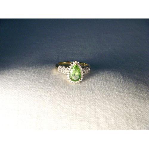 You are looking at an estate 14K yellow gold peridot and diamond ring. This lovely piece features one natural tear shape peridot measuring 10 mm by 6 mm and 53 brilliant round diamonds measuring 1 mm each. The total weight of the diamonds is .27 of a carat. The top of the ring measures 1/2 of an inch long by 3/8 of an inch wide. It is a size 7. Sizing is available. The ring weighs 4.5 grams. It is in mint condition.