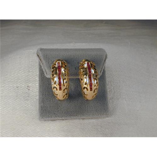 You are looking at a pair of lovely 14K yellow gold hoop earrings with rubies and diamonds. Each lovely piece features a yellow gold filigree design with 8 brilliant round diamonds, each measuring 1 mm in diameter and 10 natural rubies, each of which measuring 1 mm by 1 mm. The total weight of the diamonds is .10 of a carat. Each earring measures 7/8 of an inch in diameter. The pair weighs 9.5 grams. They are in mint condition.