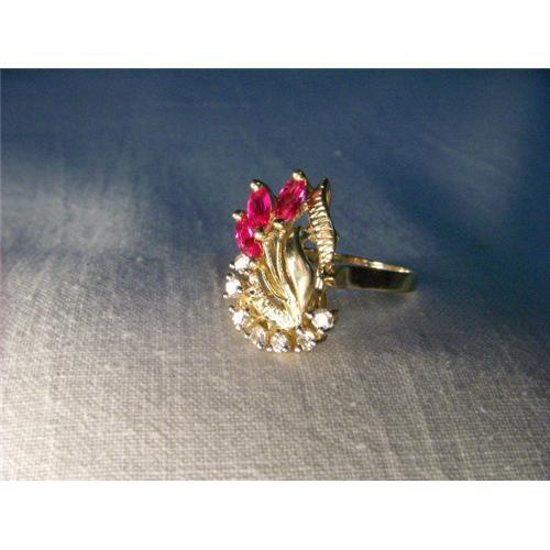 <tr><td>Title:Estate 14K YG Ruby Diamond Filigree Flower Ring</td></tr>
