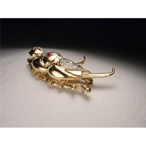 <tr><td>Title:Estate 14K YG Ruby Diamond Lovebirds Brooch</td></tr>