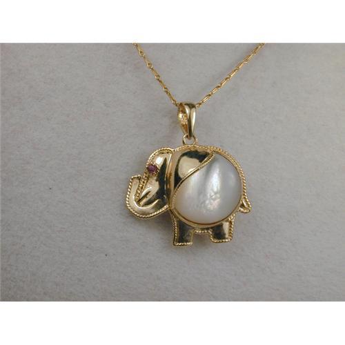 <tr><td>Title:Estate 14K YG Ruby Mobe Pearl Elephant Pendant</td></tr>