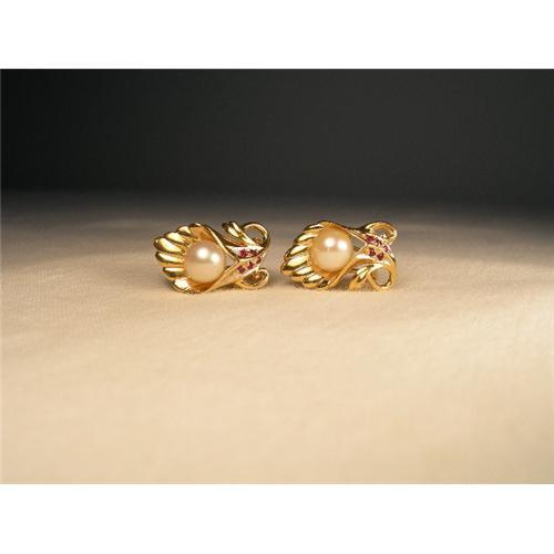 You are looking at a pair of estate 14K yellow gold earrings with rubies and pearls. Each gorgeous earring features 1 cultured white pearl measuring 6 mm in diameter. The pearl is surrounded by 5 natural rubies, each measuring 1 mm in diameter and 4 tiny diamonds. Each piece measures 3/4 of an inch long by about 1/2 of an inch wide. The pair weighs 7 grams. They are in mint condition.