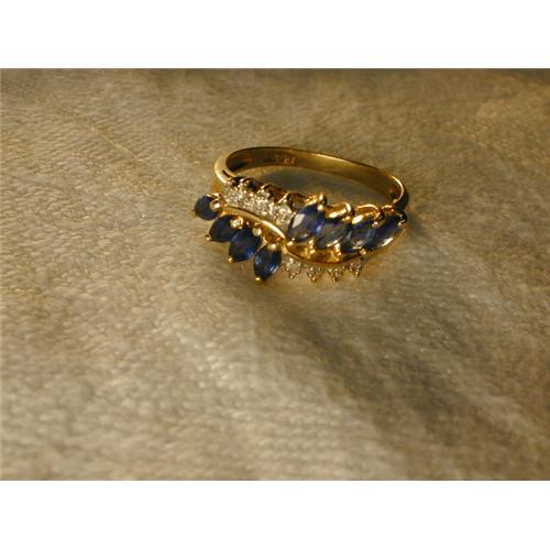 You are looking at an estate 14K yellow gold band with sapphires and diamonds. There are 8 genuine sapphires and 8 diamonds. The top of the ring measures 3/4 of an inch long by 3/8 of an inch wide. It is a size 6.75. Sizing is available. This ring weighs 3 grams. It is in mint condition.