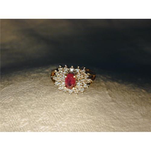 You are looking at an estate 14K yellow gold ruby and diamond ring. All gemstones are natural. There are 21 brilliant round diamonds in this stunning piece. The center oval ruby measures 4 mm by 6 mm. The top of the ring measures almost .50 of an inch wide. It is a size 6. Sizing is available. The ring weighs 3.5 grams. It is in mint condition.