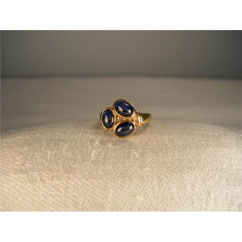 You are looking at an estate 14K yellow gold star sapphire ring. This beautiful piece features 3 natural oval sapphires, each measuring 7 mm long by 5 mm wide. The top of the ring measures 1/2 of an inch in diameter. It is a size 7.25. Sizing is available. This ring weighs 3.6 grams. It is in mint condition.
