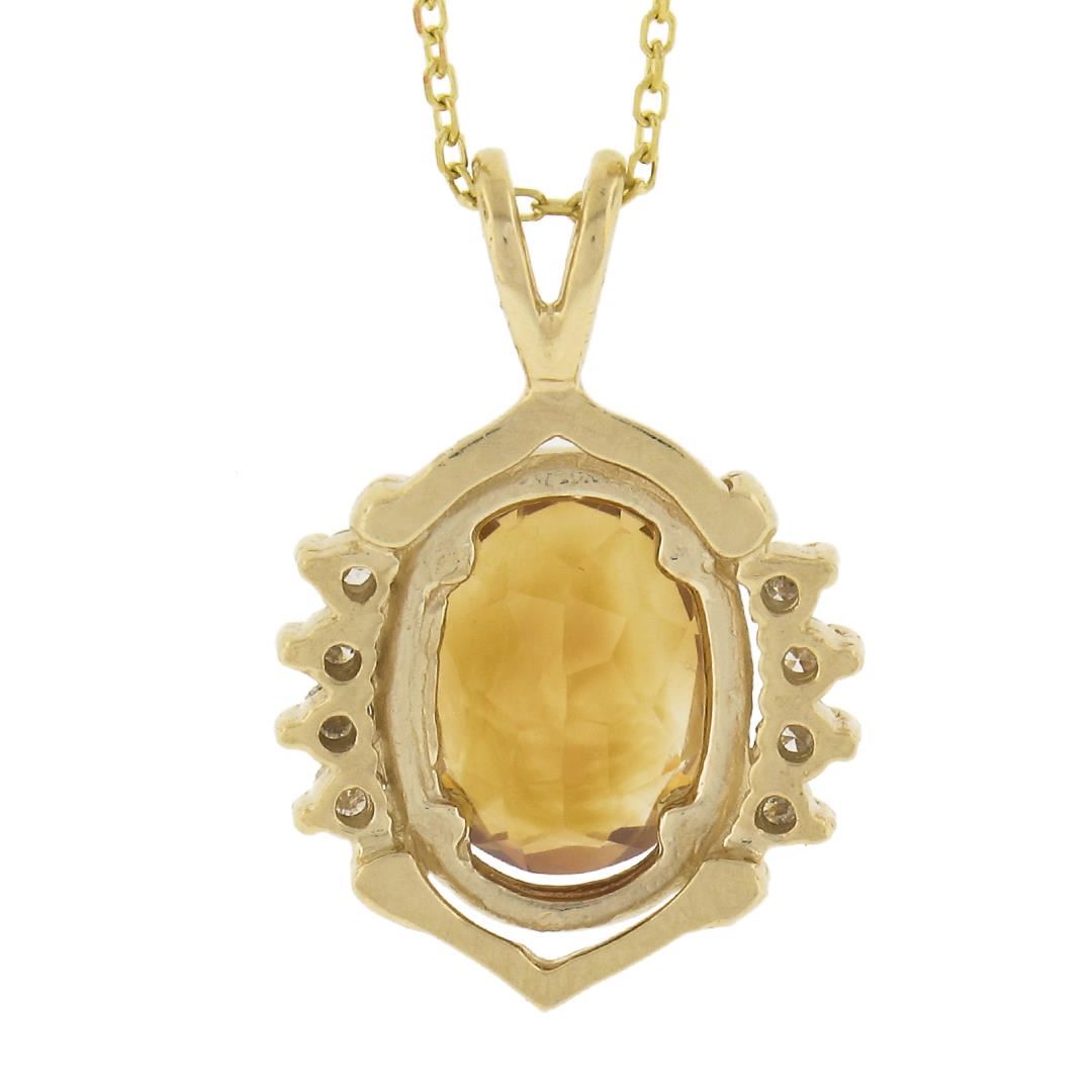 A solid 14k yellow gold pendant necklace, featuring 1 oval cut natural citrine (10.1x8.1mm), and 8 natural diamonds (H/I - I1/I2 ; 0.10ctw). Adjustable 16 & 18 inch cable link chain, 3.66 grams total weight, pendant measures 20.7x14.1mm.