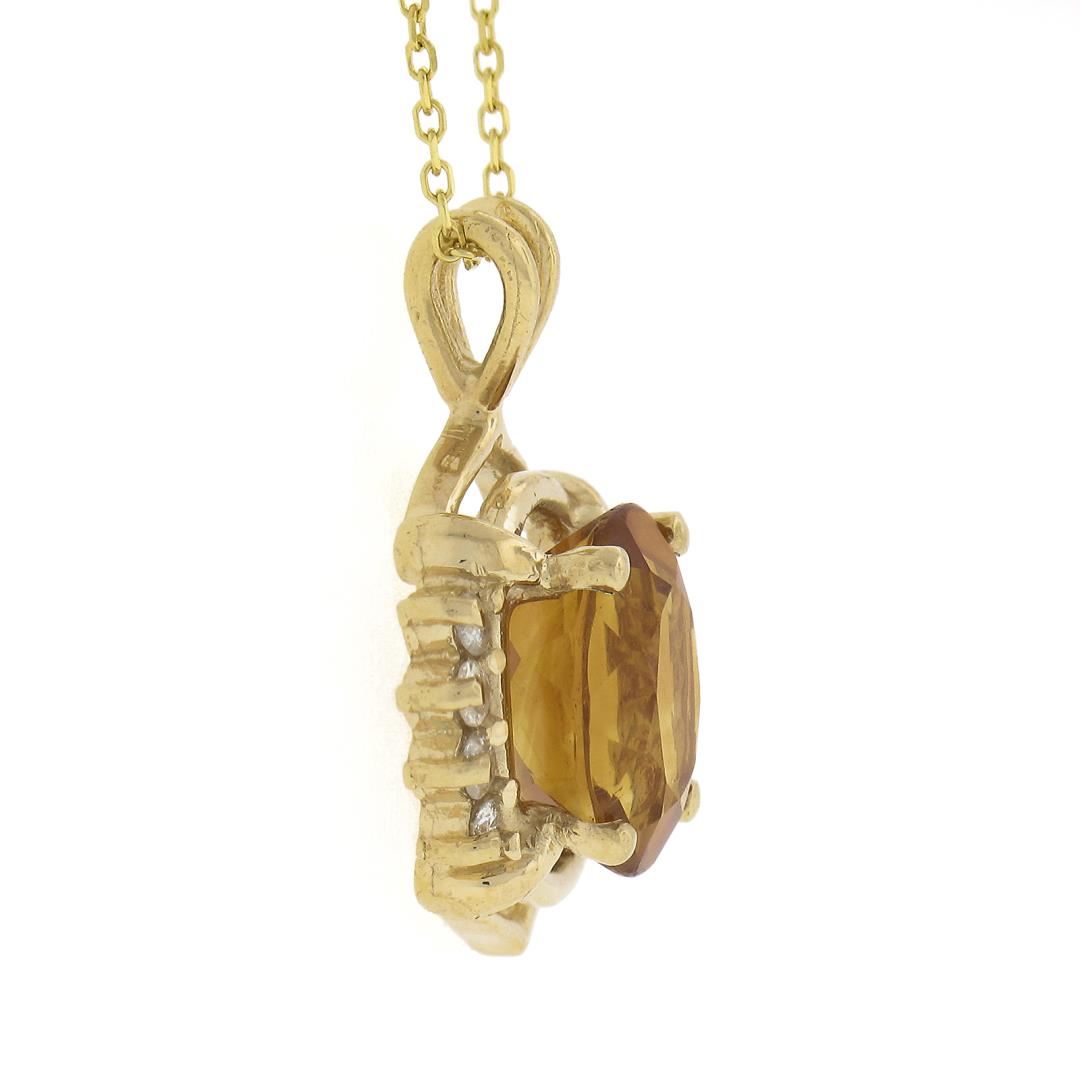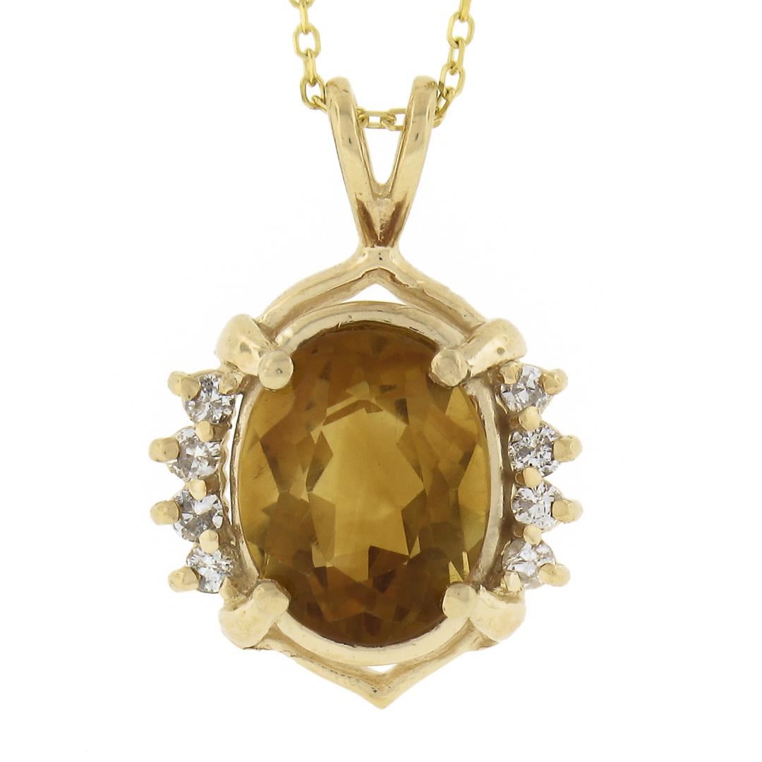A solid 14k yellow gold pendant necklace, featuring 1 oval cut natural citrine (10.1x8.1mm), and 8 natural diamonds (H/I - I1/I2 ; 0.10ctw). Adjustable 16 & 18 inch cable link chain, 3.66 grams total weight, pendant measures 20.7x14.1mm.