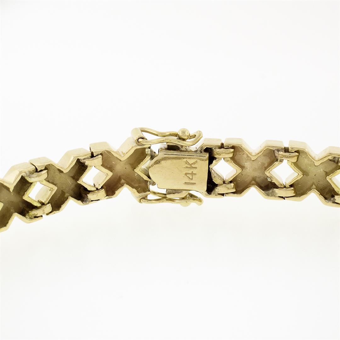 A solid 14k yellow & white gold x line link bracelet, with 5 round brilliant cut natural diamonds (G/H- VS2/SI1; 0.10ctw ). It weighs a total of 20.91 grams, measures 7.1mm wide, and measures 7 inches in length.