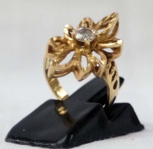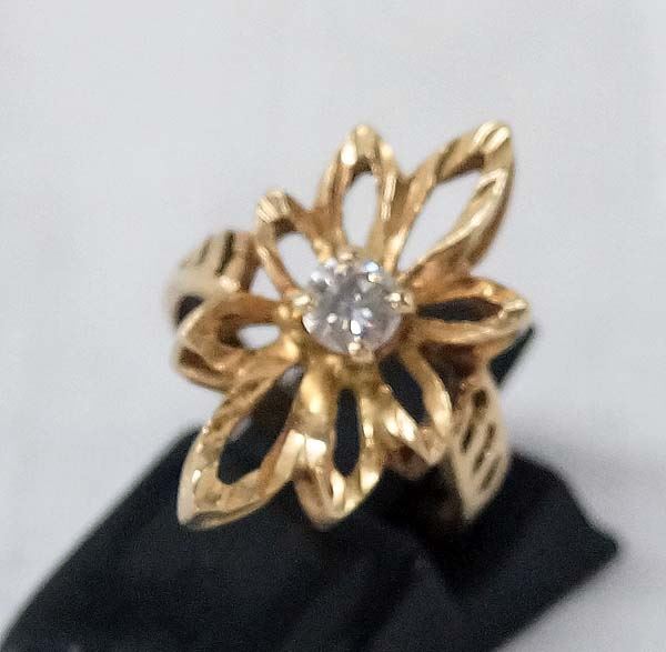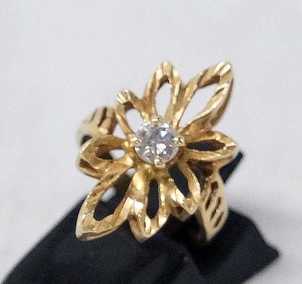 From the Posey Estate we have a sweet 14Kt Gold and Diamond Ring, size 3.75, measures 1''W, stamped 14K, laser cut design, 3.2g in total wt.