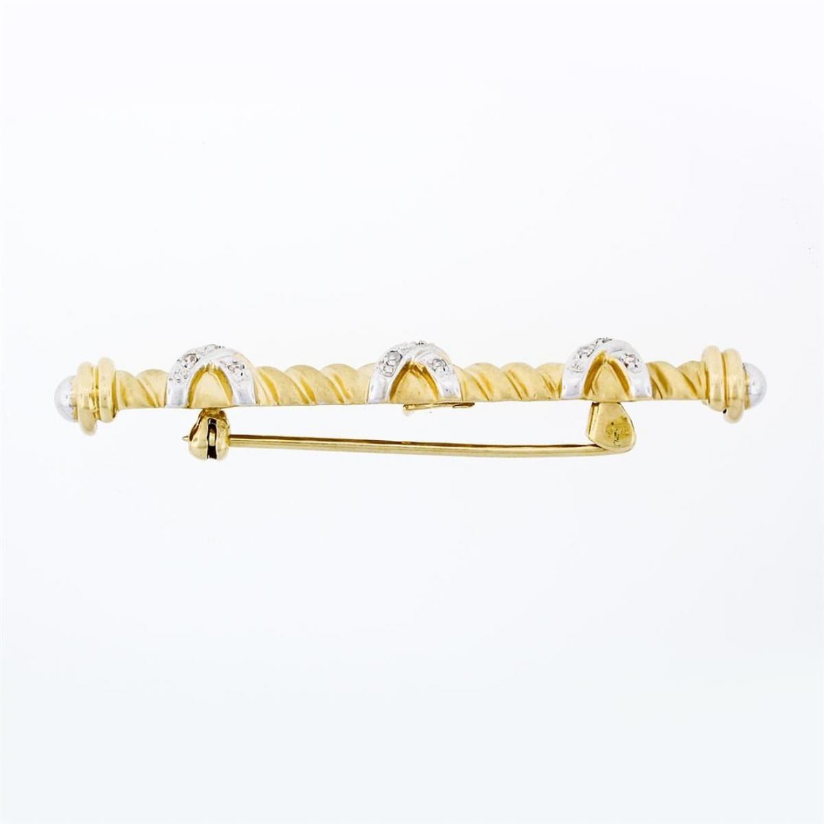 Estate 14k Gold Single Cut Diamond "X" Figure Satin Twisted Cable Bar Pin Brooch. A solid 14k yellow and white gold bar pin featuring a twisted gold cable design accented by 3 white gold X's that are topped with 15 round single cut natural diamonds (I/J - VS2; 0.07ctw). Measures 6.8x52.5mm and weighs a total of 5.42 grams.