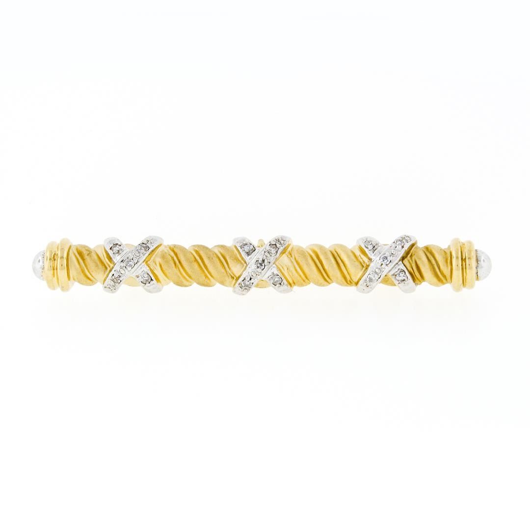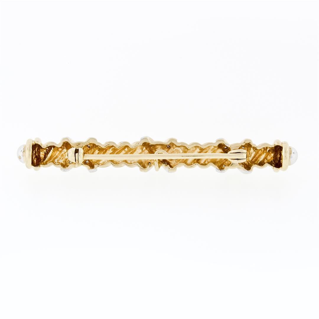 An estate solid 14k yellow & white gold bar pin brooch, with 15 single cut natural diamonds (I/J - VS2 ; 0.07ctw). Measures 6.80x52.50mm and weighs a total of 5.42 grams.