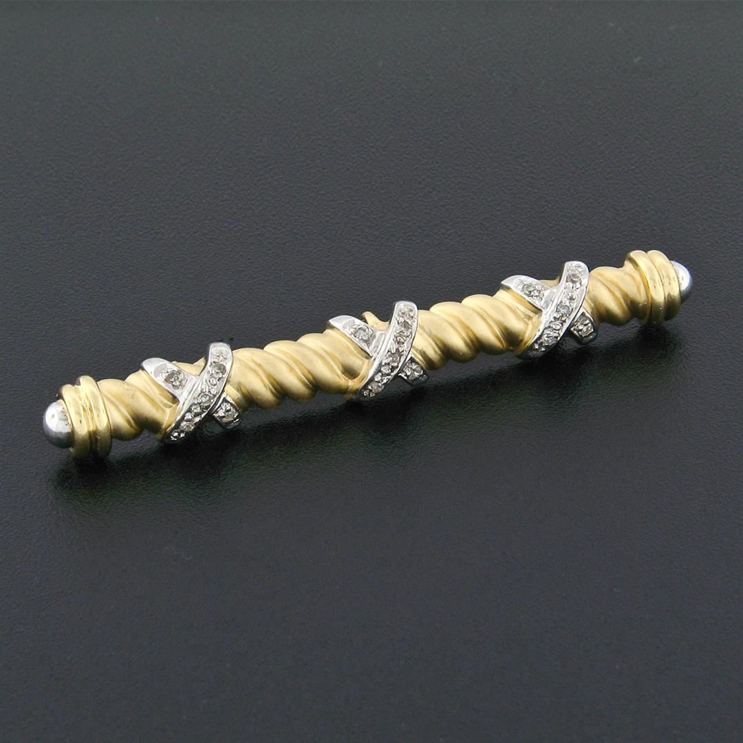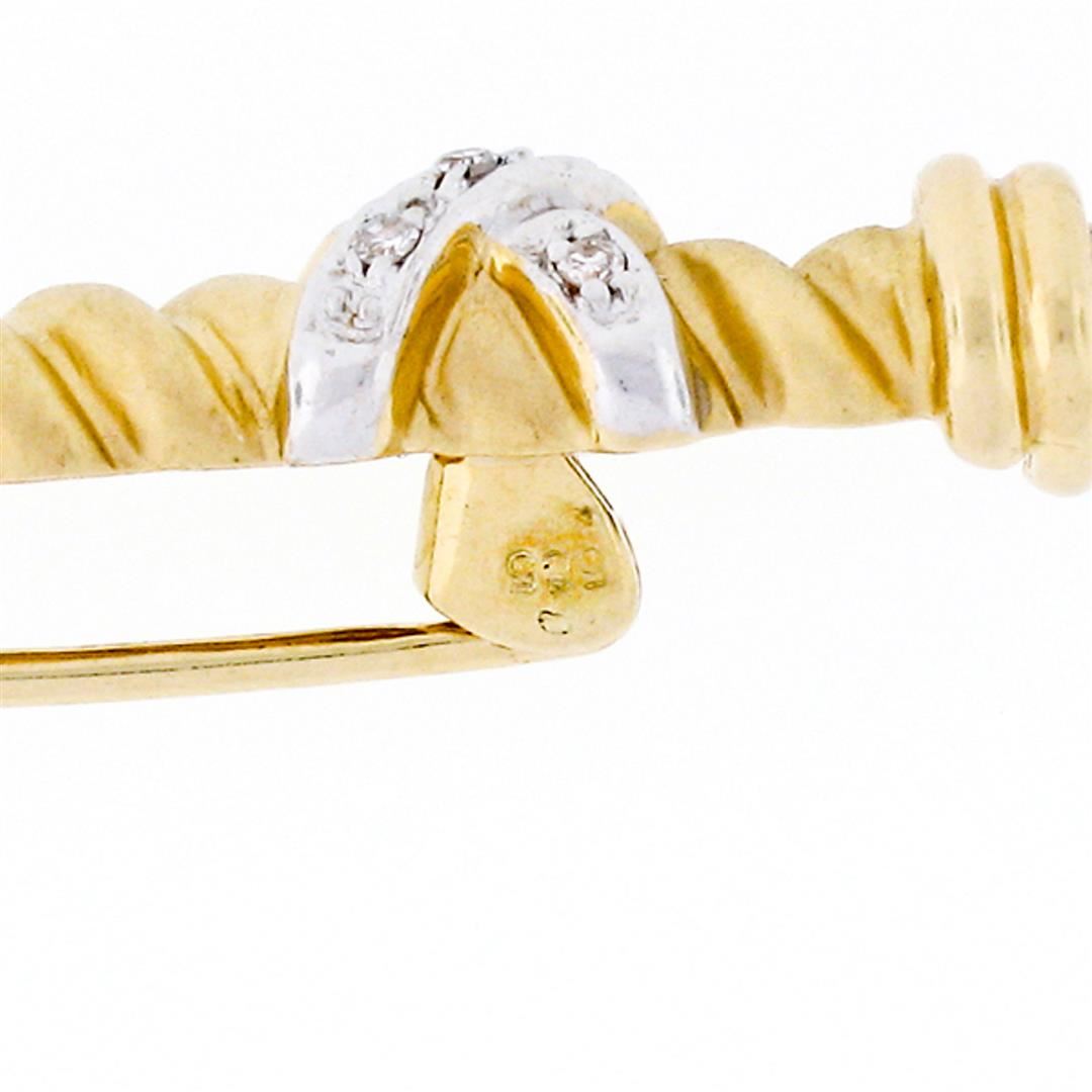 An estate solid 14k yellow & white gold bar pin brooch, with 15 single cut natural diamonds (I/J - VS2 ; 0.07ctw). Measures 6.80x52.50mm and weighs a total of 5.42 grams.
