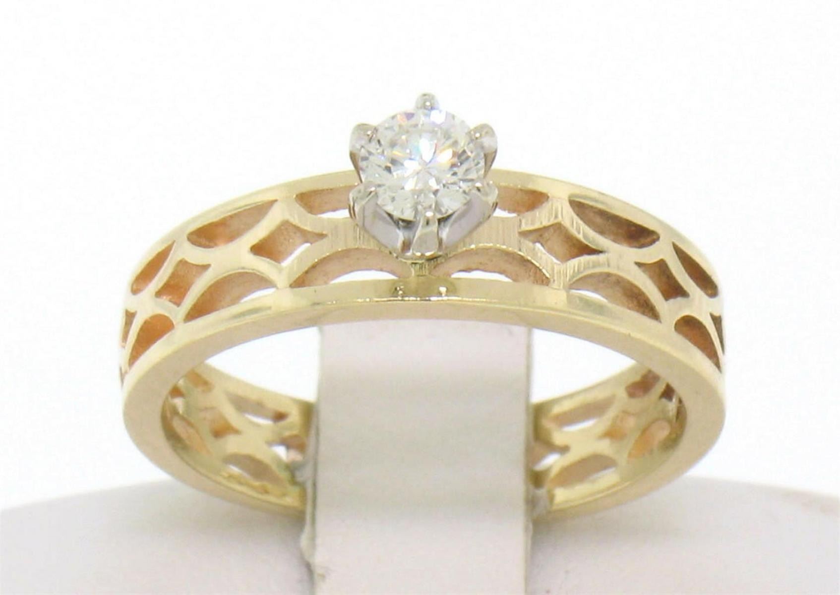 One 14k Yellow Gold 0.17ct Round Diamond Solitaire Ring w/ Pierced Open Work Setting. Item Details: Material: Solid 14k Yellow Gold w/ 14k White Gold Head, Weight: 2.40 Grams, Stone(s): (1) Natural Genuine Diamond - Round Brilliant Cut - Six-Prong Set - F Color - VS1 Clarity - 0.17ct (approx.), Size: 4.0 , Width: 4.25mm, Condition: Estate piece in like new condition.