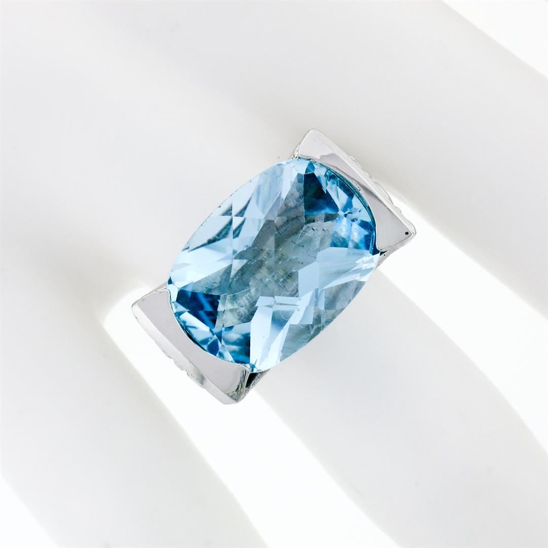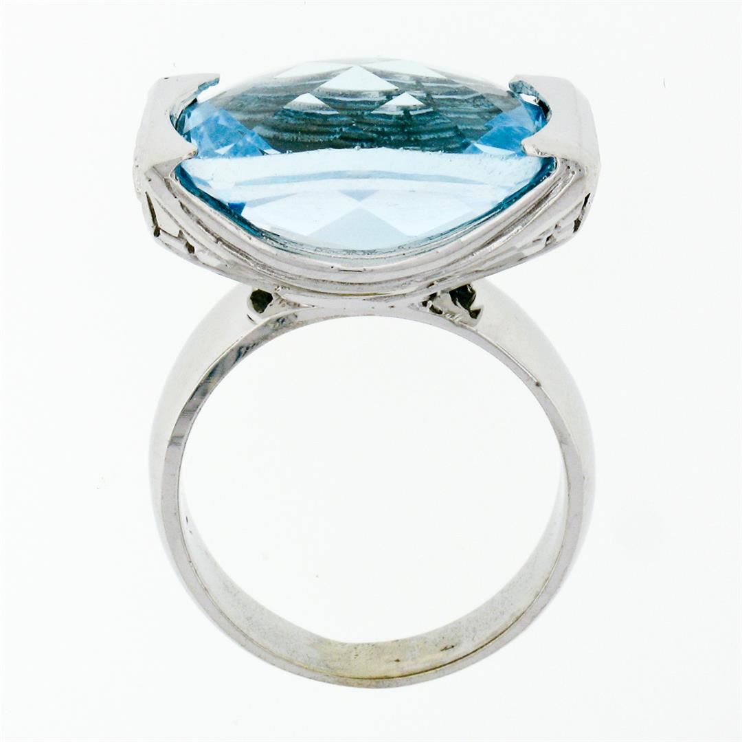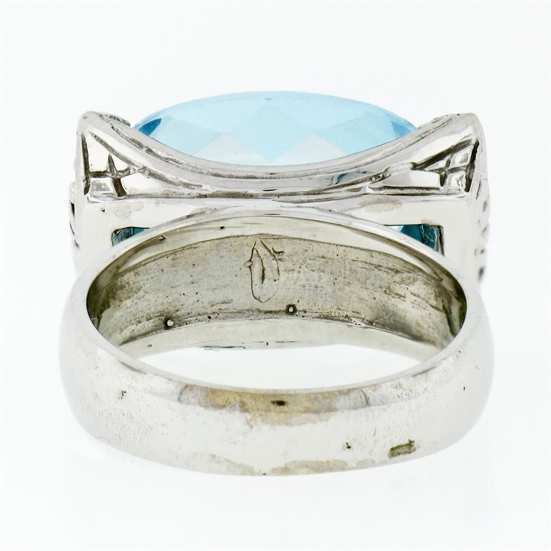 A 14k white gold solitaire cocktail ring featuring a half-bezel set oval checkerboard cut blue topaz (16.4x11.9mm). The ring is size 6.5, weighs a total of 11.74 grams, and measures 11.9mm wide.