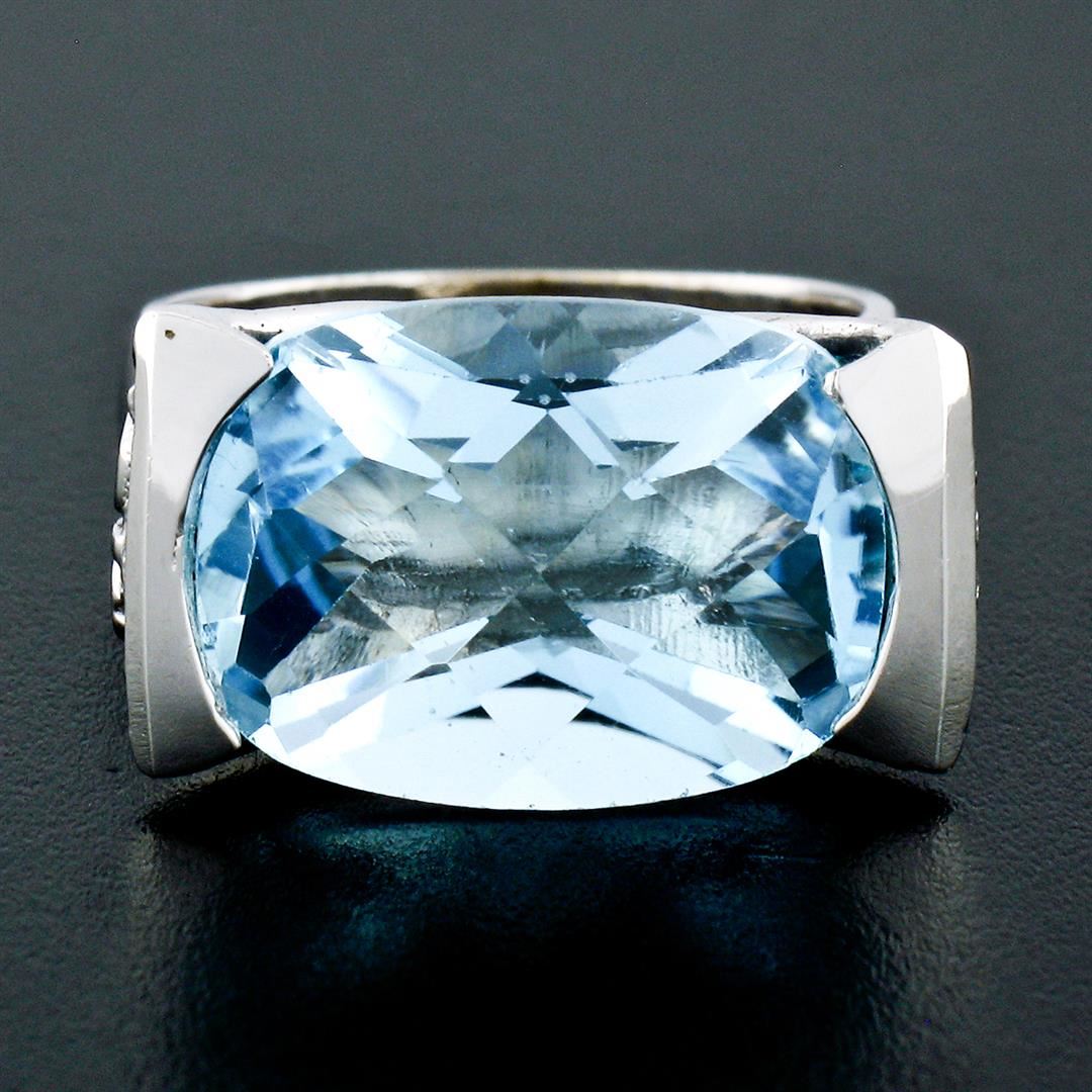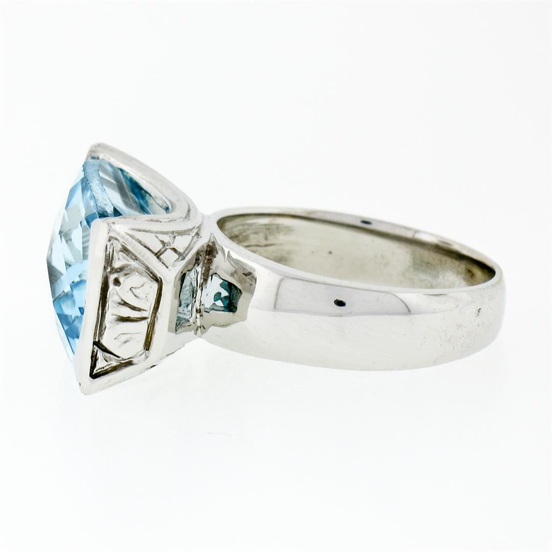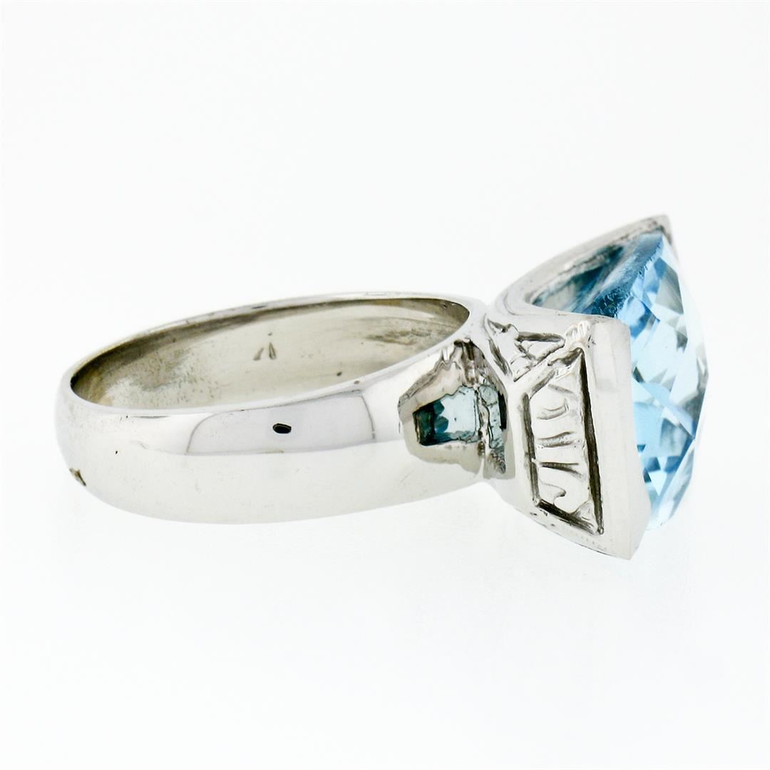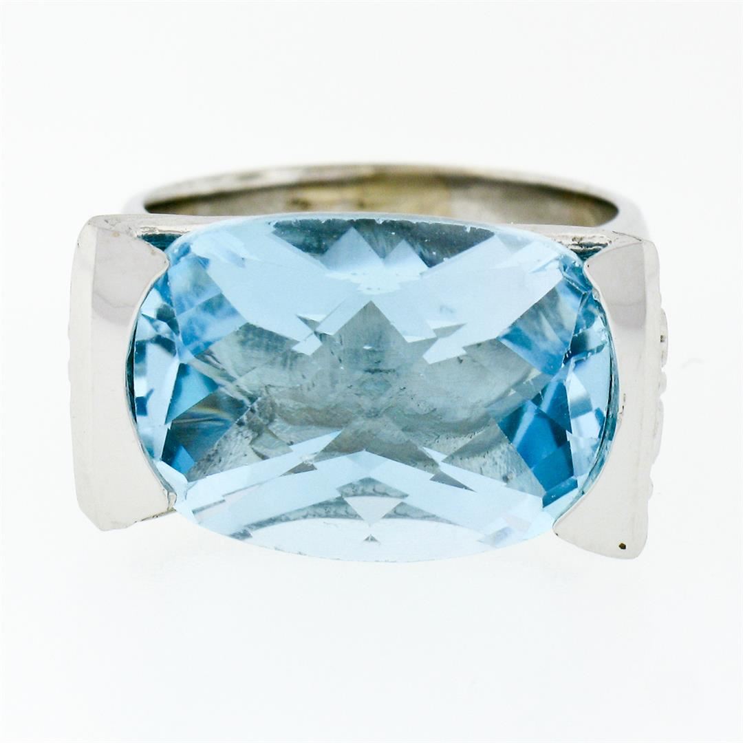 A 14k white gold solitaire cocktail ring featuring a half-bezel set oval checkerboard cut blue topaz (16.4x11.9mm). The ring is size 6.5, weighs a total of 11.74 grams, and measures 11.9mm wide.