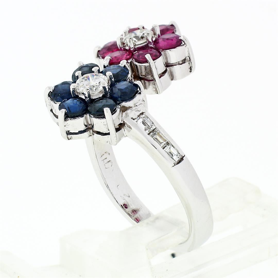 A solid 14 k white gold floral bypass ring, with 6 round brilliant cut natural rubies (0.66ctw), 6 round brilliant cut natural sapphire (0.66ctw), 2 round brilliant cut natural diamonds (G - VS1; 0.20ctw), and 6 rectangular step cut natural diamonds (F/G - VS1/VS2; 0.18ctw). The ring is size 5.0, weighs a total of 4.34 grams, and measures 17.7mm wide.