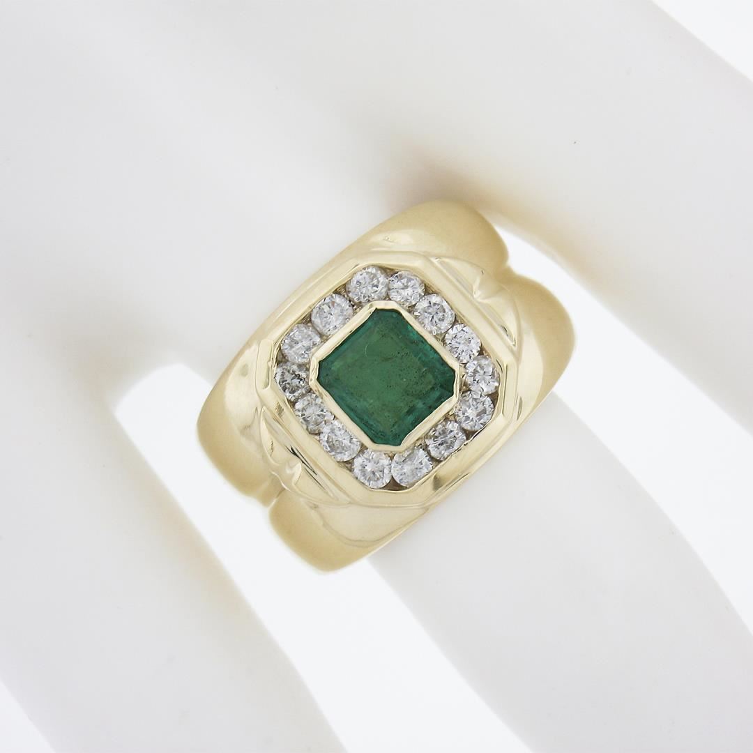 A solid 14k yellow gold wide band ring, with 1 emerald cut natural emerald (1.0ct), and 14 round cut natural diamonds ( G/H - I1/I2 ; 0.56ctw. The ring is size 6.75, weighs a total of 8.29 grams, and measures 13.6mm wide.