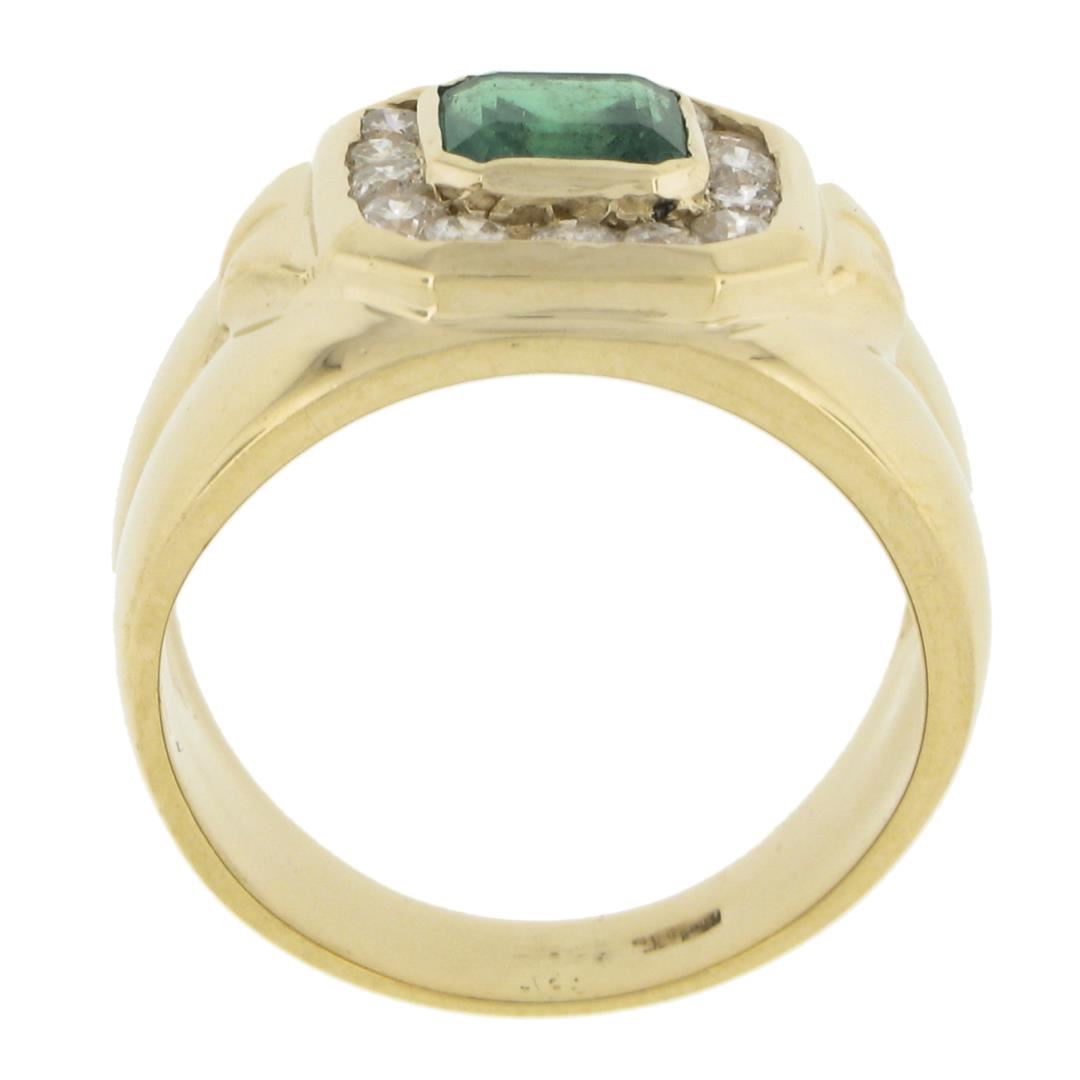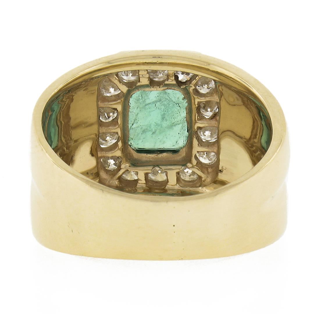 A solid 14k yellow gold wide band ring, with 1 emerald cut natural emerald (1.0ct), and 14 round cut natural diamonds ( G/H - I1/I2 ; 0.56ctw. The ring is size 6.75, weighs a total of 8.29 grams, and measures 13.6mm wide.