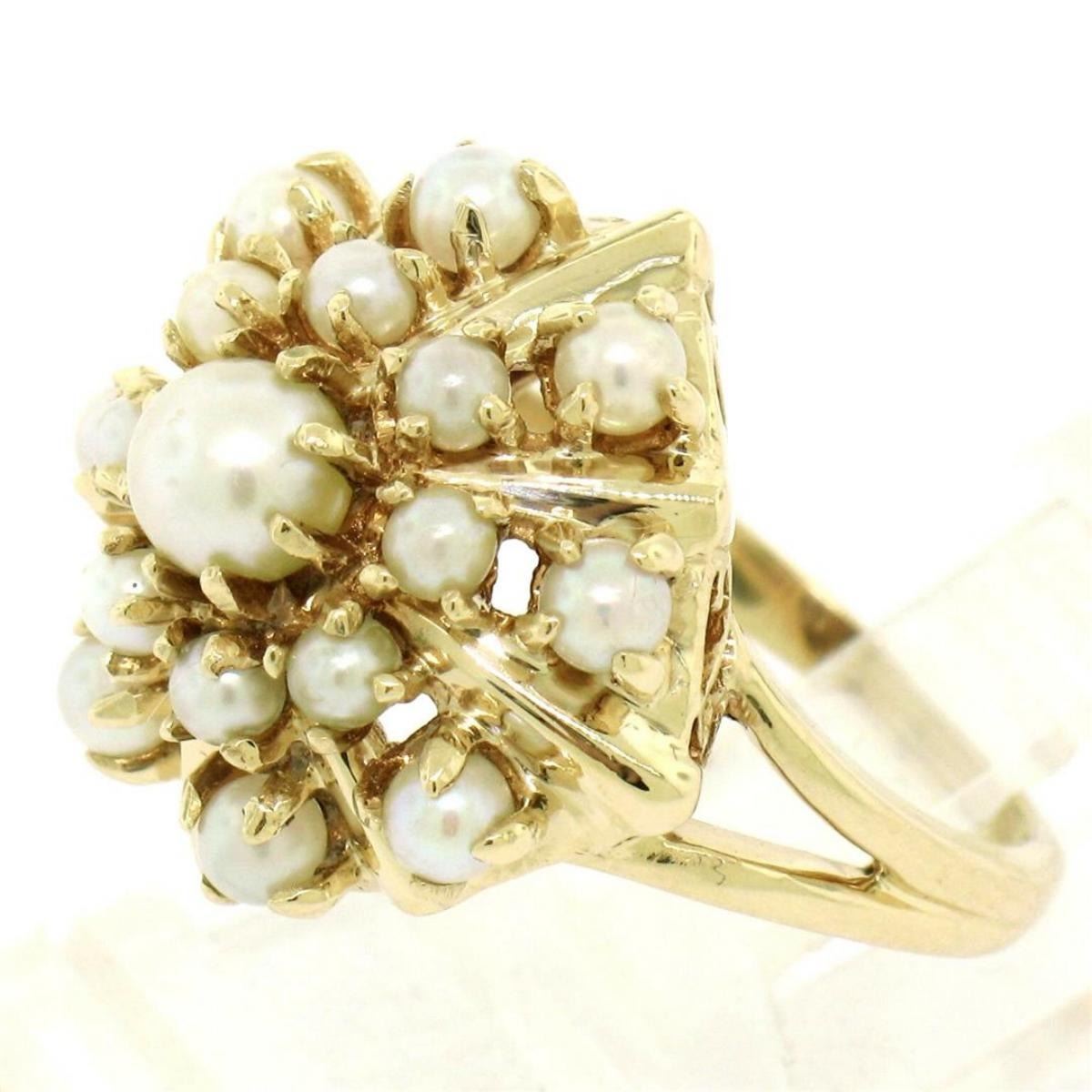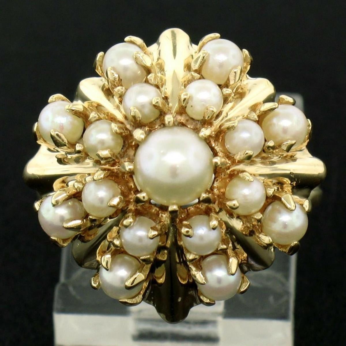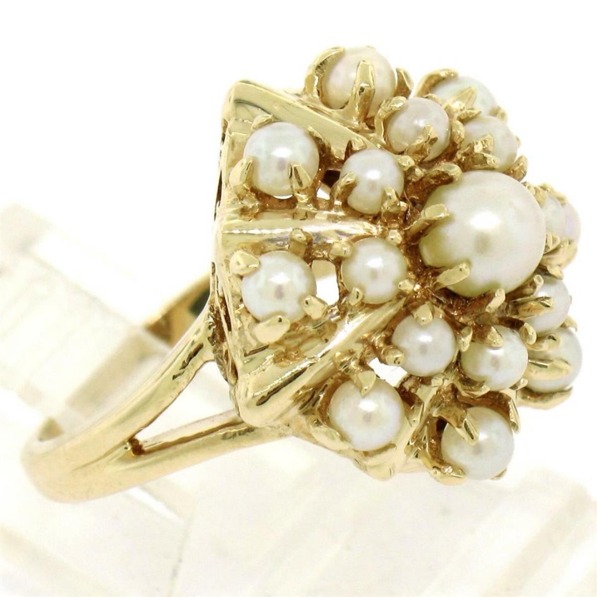Estate 14k Yellow Gold 3 Tier 17 Pearl Snowflake Burst Cluster Cocktail Ring