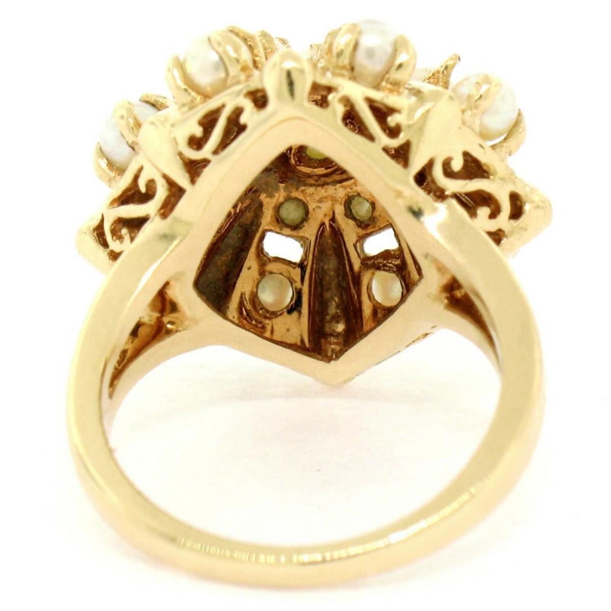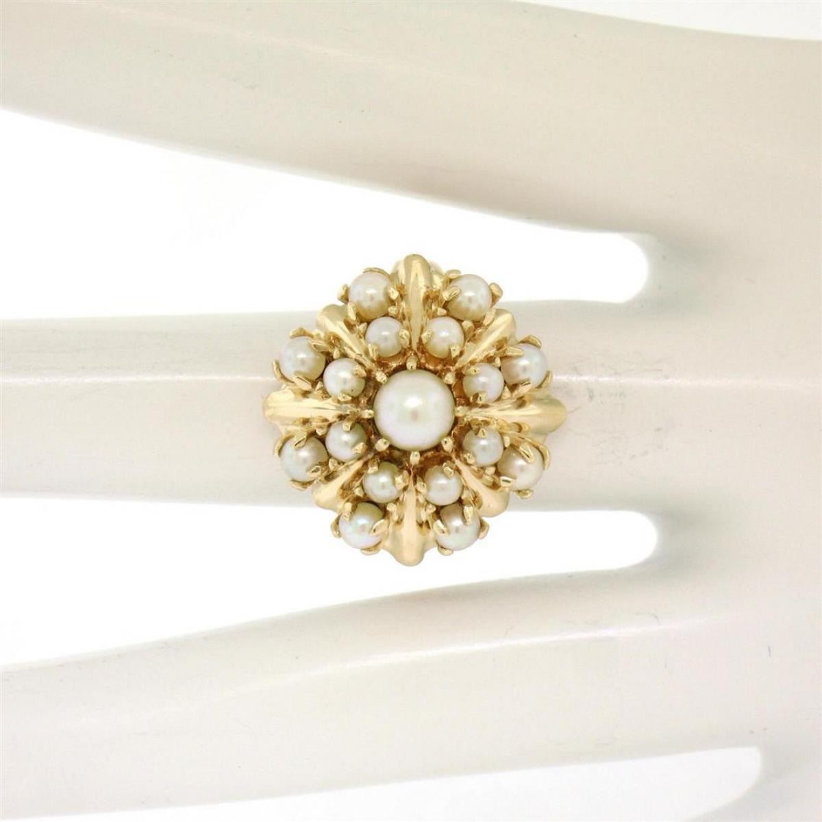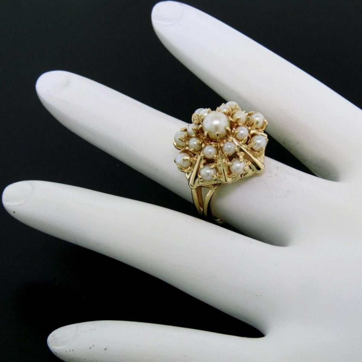 Estate 14k Yellow Gold 3 Tier 17 Pearl Snowflake Burst Cluster Cocktail Ring