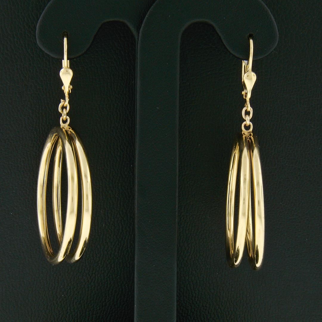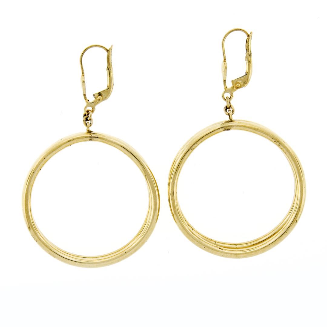 An estate solid 14k yellow gold hoop dangle earrings. The earrings measure overall height approximately 54.3mm and weigh a total of 10.92 grams.