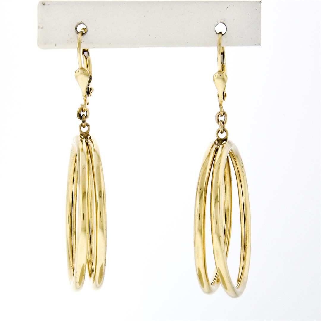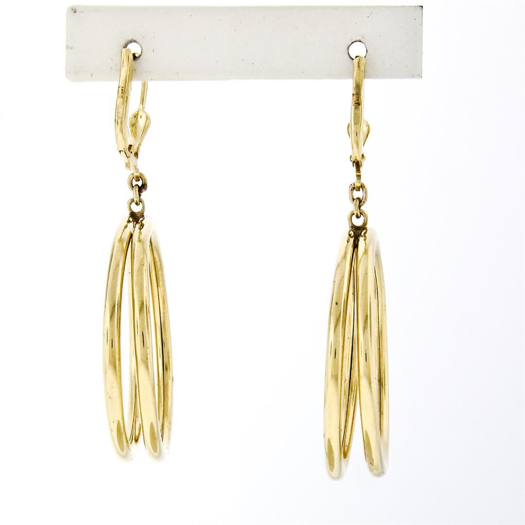 An estate solid 14k yellow gold hoop dangle earrings. The earrings measure overall height approximately 54.3mm and weigh a total of 10.92 grams.