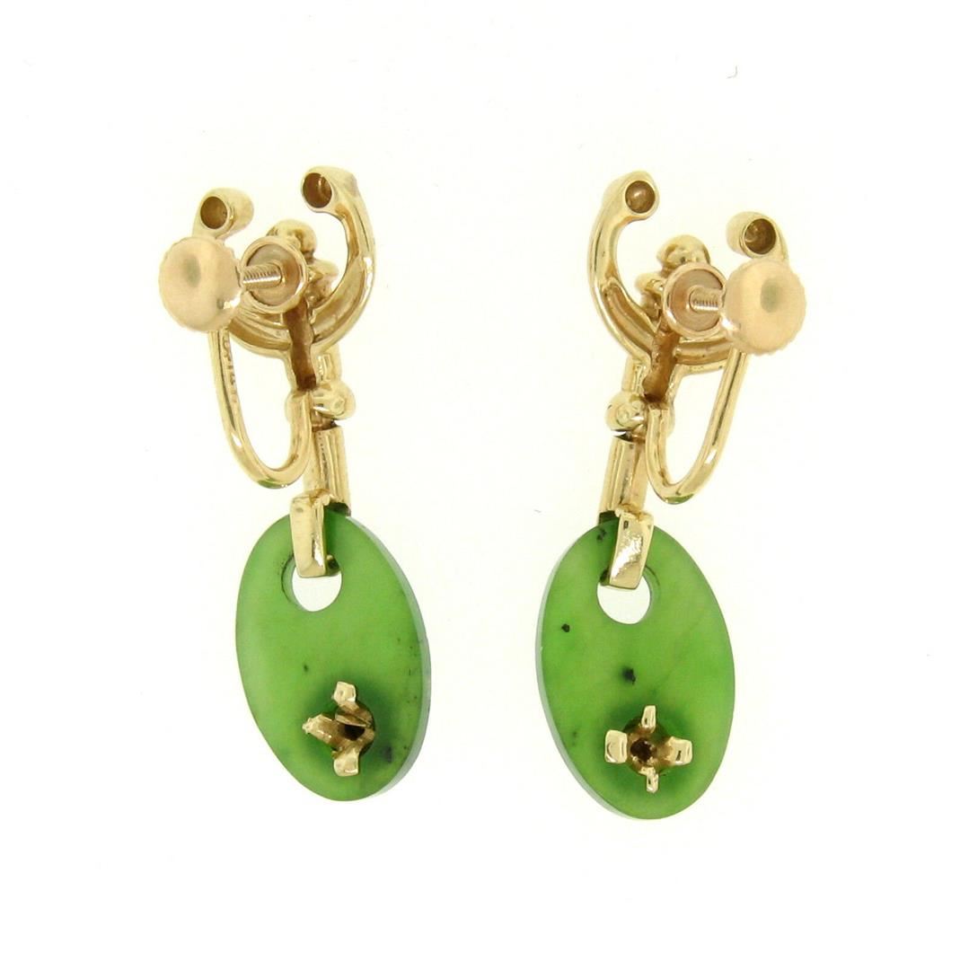 Estate 14k Yellow Gold Oval Disk Jade Screw On Drop Dangle Earrings