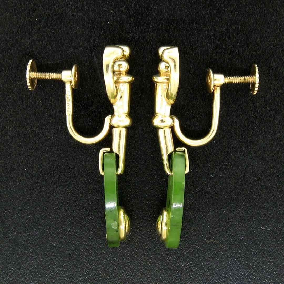 Estate 14k Yellow Gold Oval Disk Jade Screw On Drop Dangle Earrings