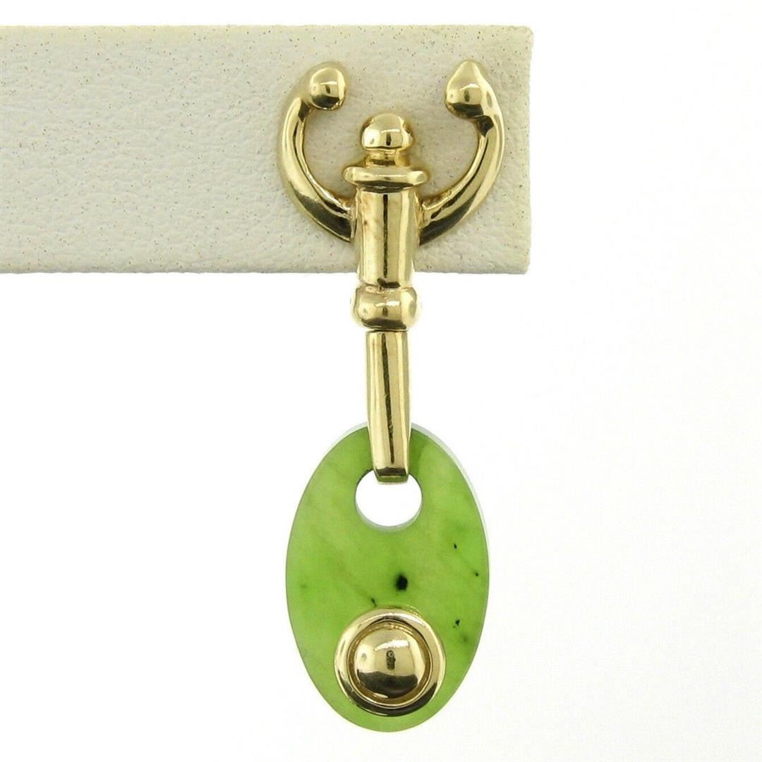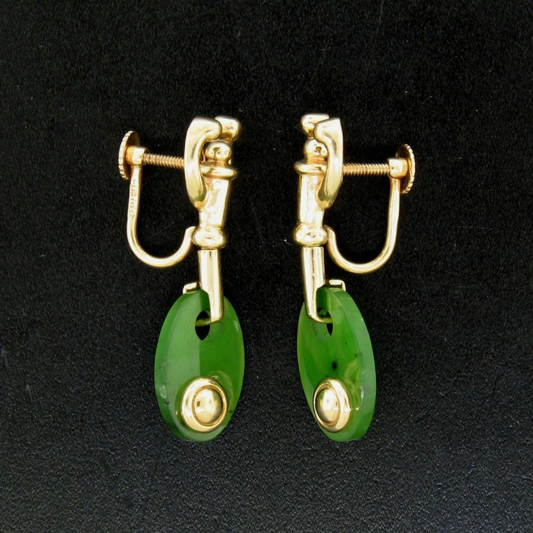 Estate 14k Yellow Gold Oval Disk Jade Screw On Drop Dangle Earrings