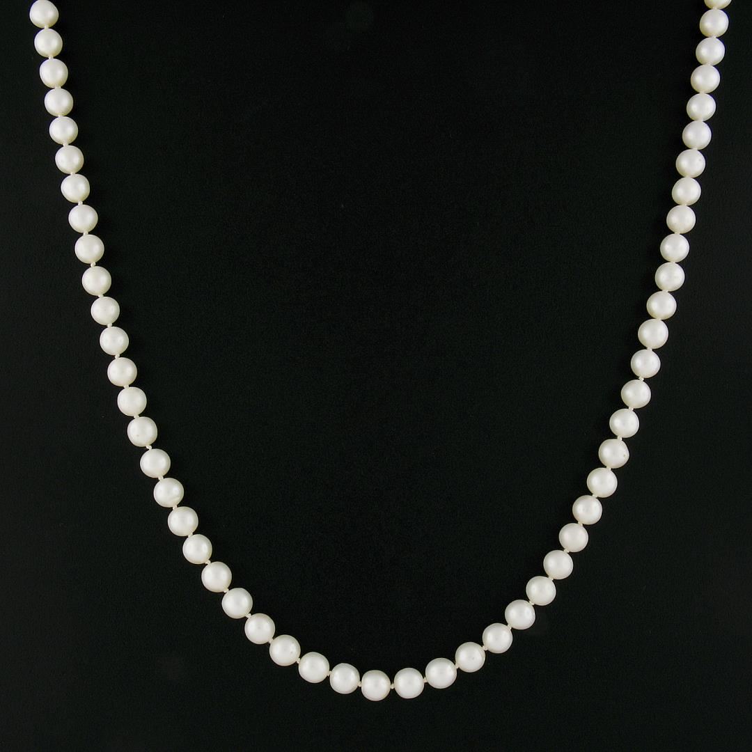 A strand necklace with 14k yellow gold clasp, featuring 68 round & semi round shape cultured pearls (6.5-6.8mm). It weighs a total of 26.18 grams, measures 6.8mm wide, and measures 18 inches in length.