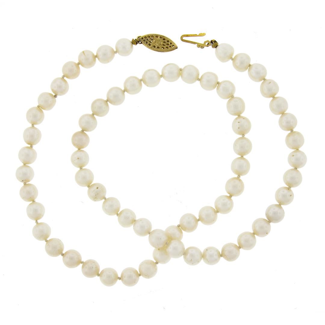 A strand necklace with 14k yellow gold clasp, featuring 68 round & semi round shape cultured pearls (6.5-6.8mm). It weighs a total of 26.18 grams, measures 6.8mm wide, and measures 18 inches in length.