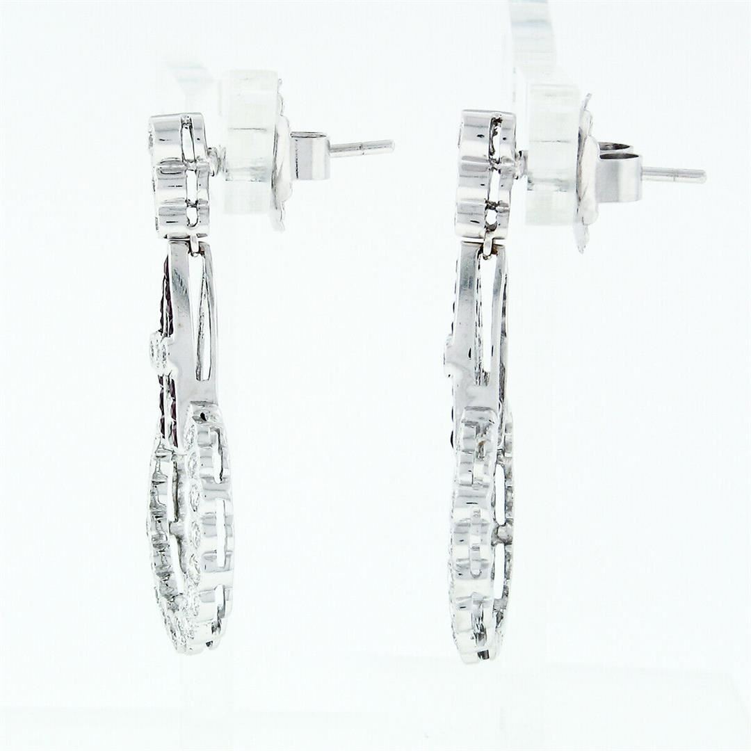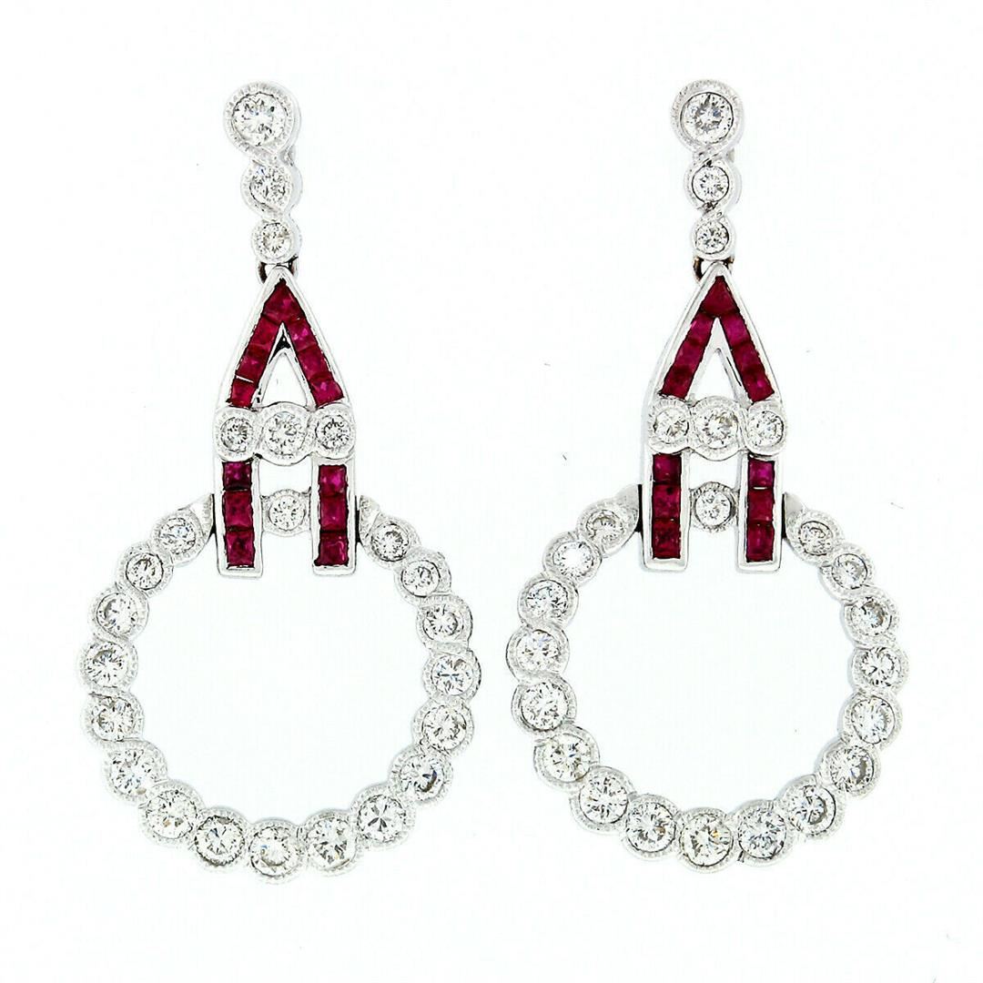 A pair of solid 18k white gold circle drop dangle earrings with 48 round brilliant cut natural diamonds (G/H - VS1/VS2; 1.50ctw), and 26 french cut natural rubies (1.0ctw). The earrings measure approximately 35x17.75mm and weigh a total of 7.56 grams.