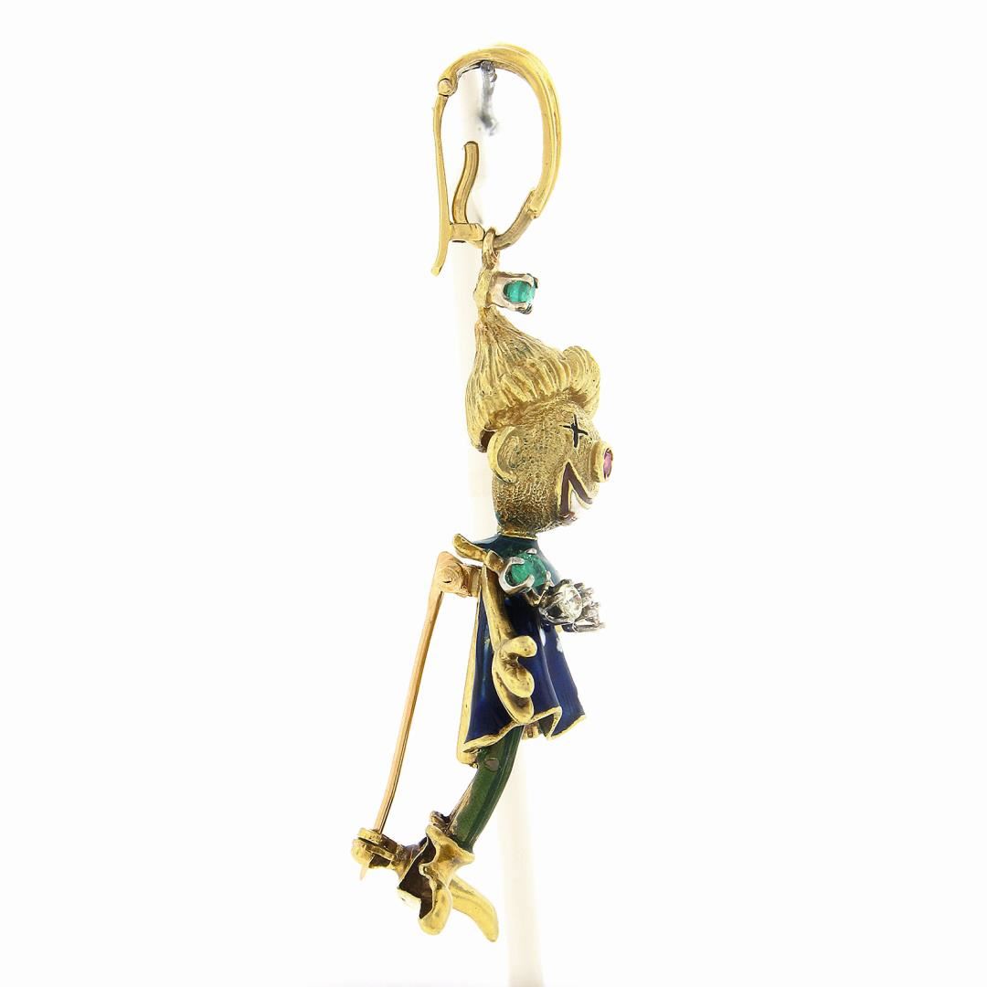 A solid 18k yellow gold and enamel workl brooch pendant, with 1 round brilliant cut natrual ruby (0.06ctw), 2 round brilliant cut natural diamonds (G/H - VS1/VS2 ; 0.14ctw), and 3 round brilliant cut natural emeralds ( 0.24ctw). Measures 64.3x24.9mm and weighs a total of 18.05 grams.