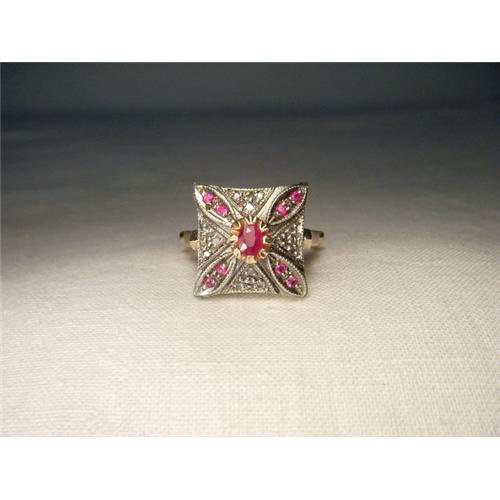 </font></strong>You are looking at an antique 18K pink gold diamond and ruby filigree ring. This lovely piece features 12 rose cut diamonds and 8 natural round rubies measuring 1 mm each. This piece also features one natural oval ruby measuring 4 mm by 3 mm. The top of the ring measures 9/16 of an inch across. It weighs 7.9 grams. It is a size 7.5. Sizing is avalible. It is in mint condition.</font>