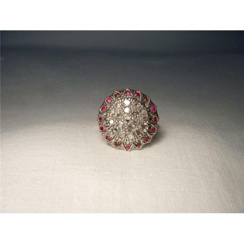 You are looking at an antique 18K pink gold diamond and ruby ring. This lovely piece features 19 rose cut diamonds with a diameter of 2 mm each. It also incudes 16 round natural rubies with a diameter of 1 mm each. The top of the ring measures 7/8 of an inch in diameter. It weighs 8 grams. It is a size 8. Sizing is avalible. It is in mint condition.