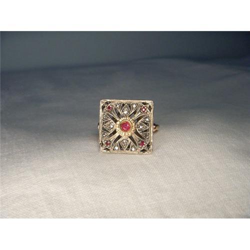 </font></strong>You are looking at an antique 18K pink gold diamond and ruby ring. This lovely piece features 12 rose cut diamonds and 4 natural round rubies measuring 1 mm each. The piece also features one natural round ruby measuring 3 mm in diameter. The top of the ring measures 11/16 of an inch across. It weighs 9.1 grams. It is a size 8.25. Sizing is avalible. It is in mint condition.</font>