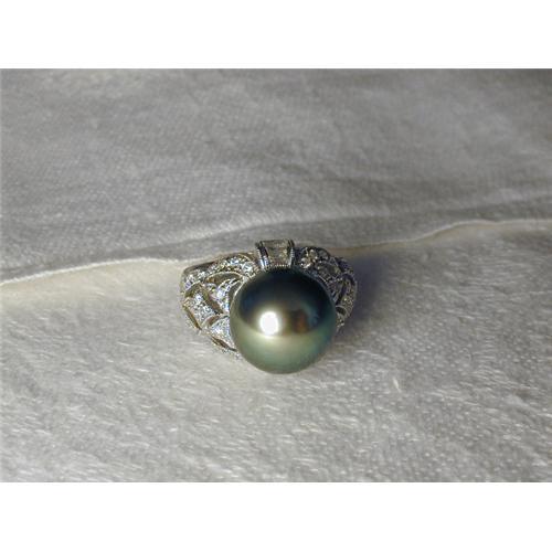 You are looking at an estate 18K white gold filigree South Sea pearl and diamond ring. This magnificent piece features a cultured black Tahitian pearl measuring 12 mm in diameter. There are 42 brilliant round and 6 baguette diamonds in this stunning piece. The top of the ring measures 5/8 of an inch wide. This ring is a size 7. Sizing is available. It weighs 9.7 grams. It is in mint condition.