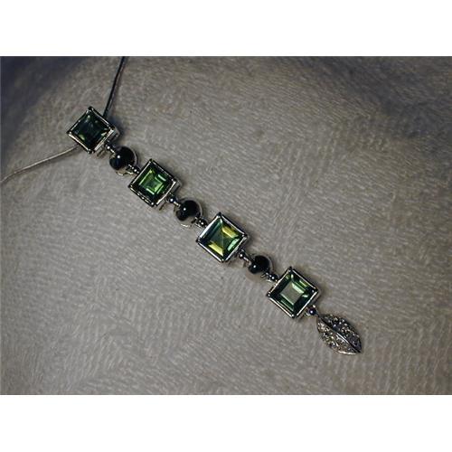 You are looking at an estate 18K white gold diamond and peridot slide. The 4 princess cut peridot measure 4 mm by 4 mm and are accented by 6 brilliant round diamonds at the base of this beautiful piece. The pendant measures almost 2 inches long by almost .25 of an inch wide. It weighs 2.4 grams. It is in mint condition.
