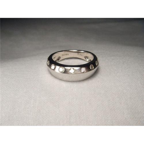 You are looking at an estate 18K white gold diamond dome band. This unique piece features 9 brilliant round diamonds measuring 2 mm each. The total weight of the diamonds is .25 of a carat. The band measures 1/4 of an inch wide. It is size 6. Sizing is available. The ring weighs 4.6 grams. It is in mint condition.