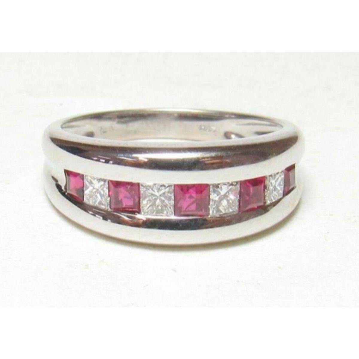 Estate 18K White Gold Natural Princess cut Red Ruby & Diamond Band Style Ring.