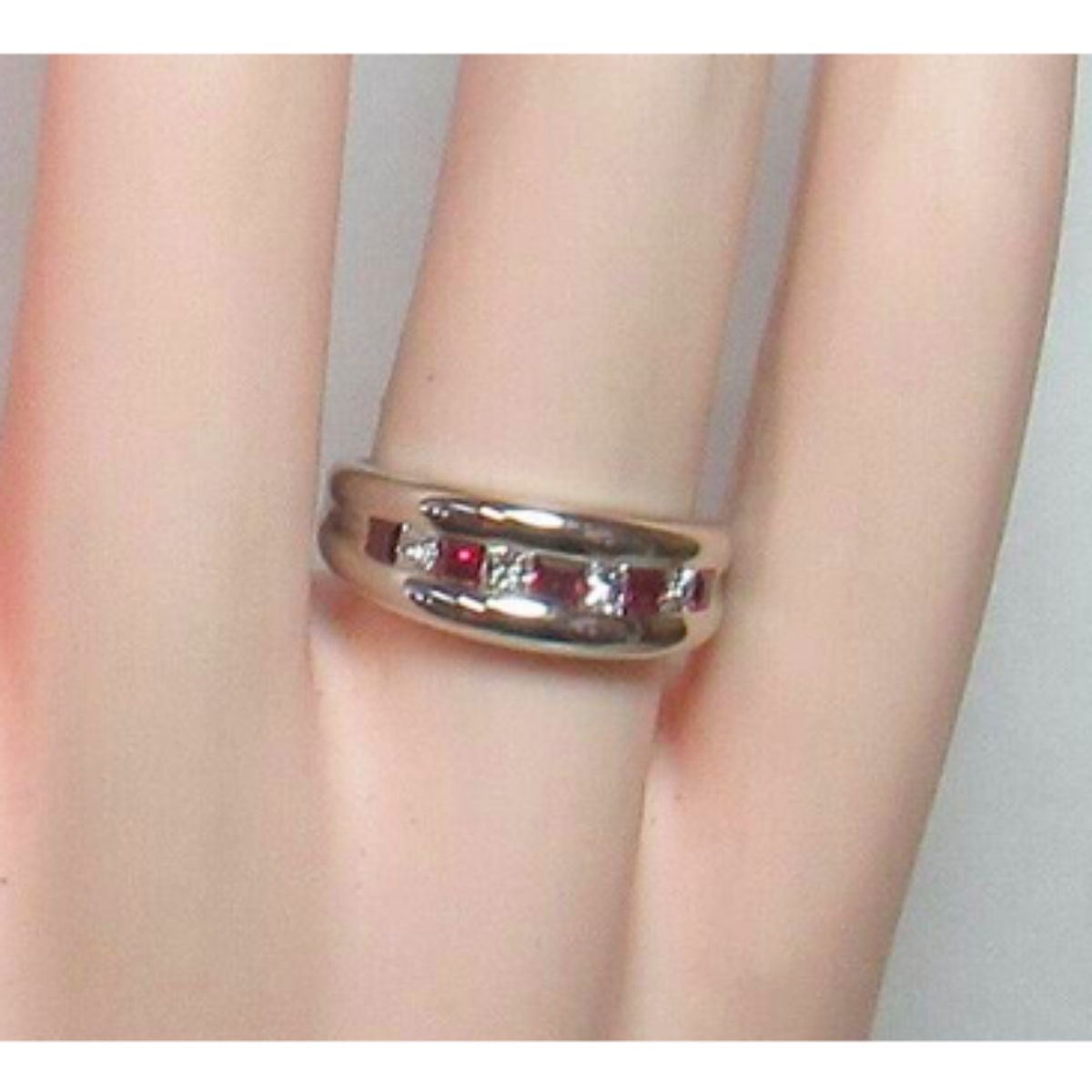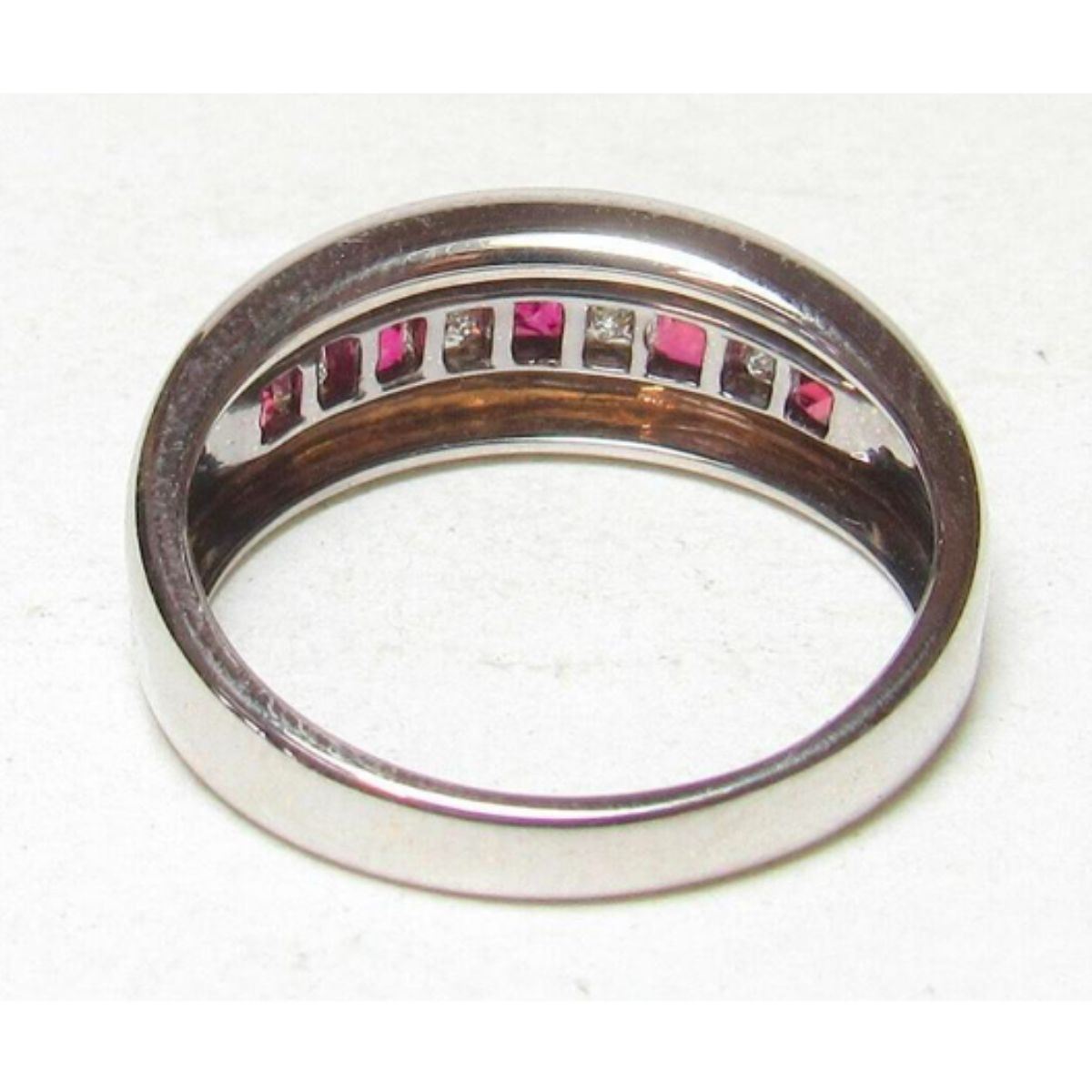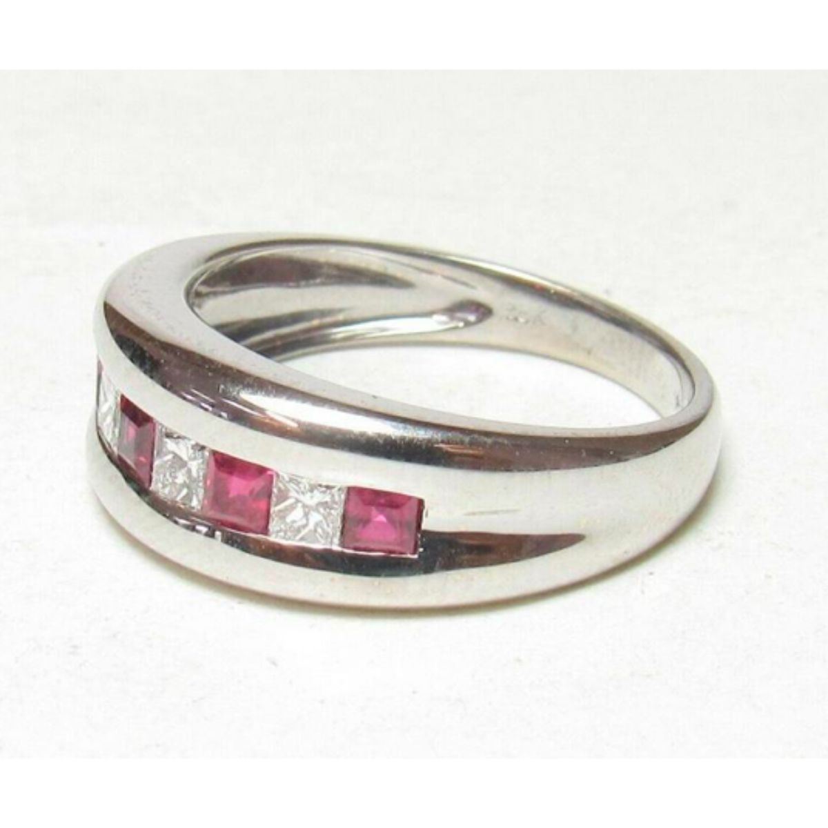 Estate 18K White Gold Natural Princess cut Red Ruby & Diamond Band Style Ring. The ring holds five princess cut red rubies with light internal flaws, an approx total weight of 0.55cts. & four princess cut diamonds, ( SI1 clarity and I in color ) approx total weight of 0.28 cts. MATERIAL: 18K white gold ( marked ) WEIGHT: 4.3 grams RING SIZE: 6.75 MEASUREMENTS: 1/4" (7.4 mm) from North to South. Â