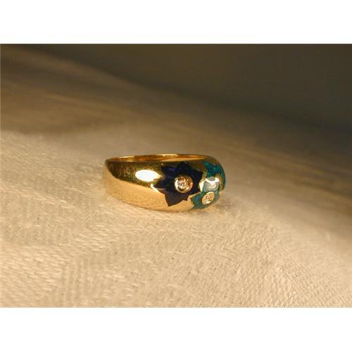 You are looking at an estate 18K yellow gold enameled diamond band. There are 3 brilliant round diamonds each measuring 1 mm in diameter. The total weight of all the diamonds is .04 of a carat. The diamonds are surrounded by blue and green enamel. The ring measures 3/8 of an inch wide. This lovely ring is a size 7.25. Sizing is available. It weighs 8 grams. It is in mint condition.