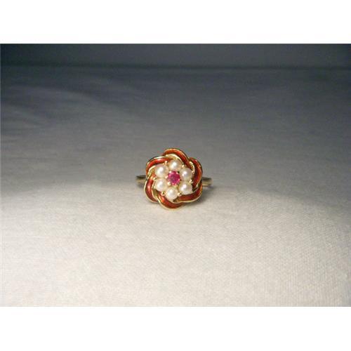 </font></strong>You are looking at an estate 18K yellow gold enamel seed pearl and ruby ring. This unique piece features one round ruby measuring 2 mm in diameter set in the center of the ring, surrounded by 6 seed pearls measuring 3 mm each. All gemstones are natural. The top of the ring measures 9/16 of an inch across. It is a size 6.75. Sizing is avalible. This ring weighs 4.9 grams. It is in mint condition.</font>