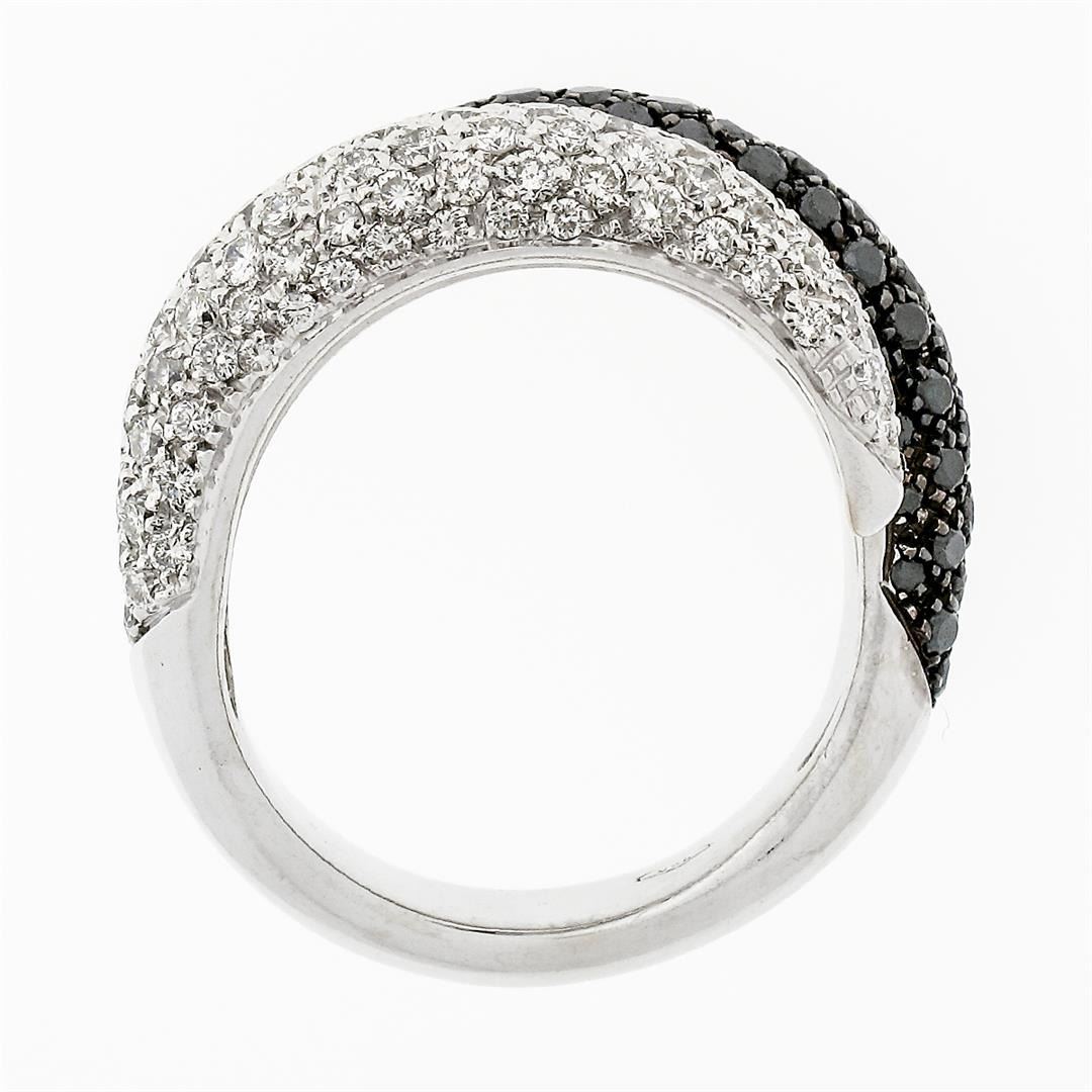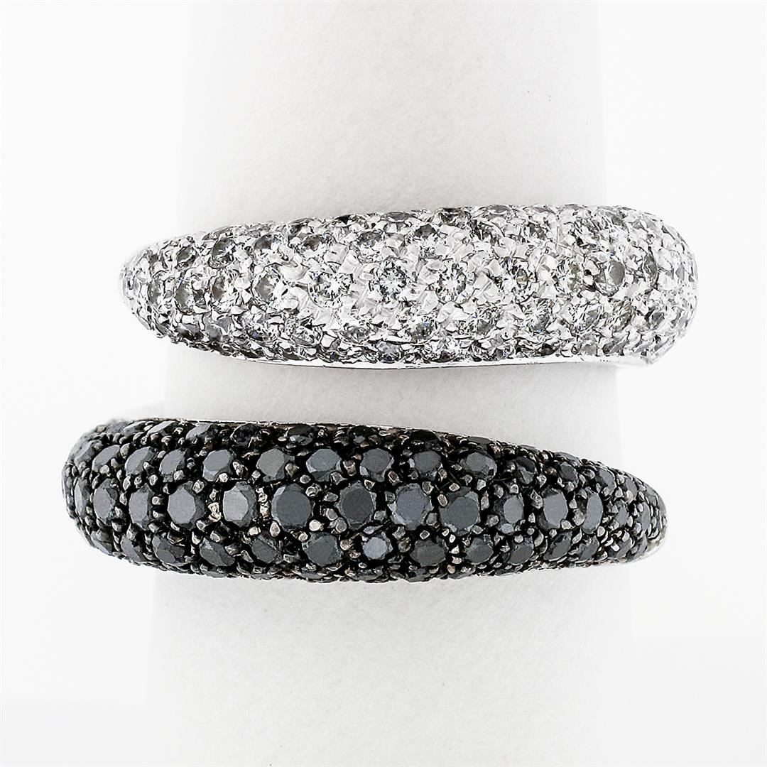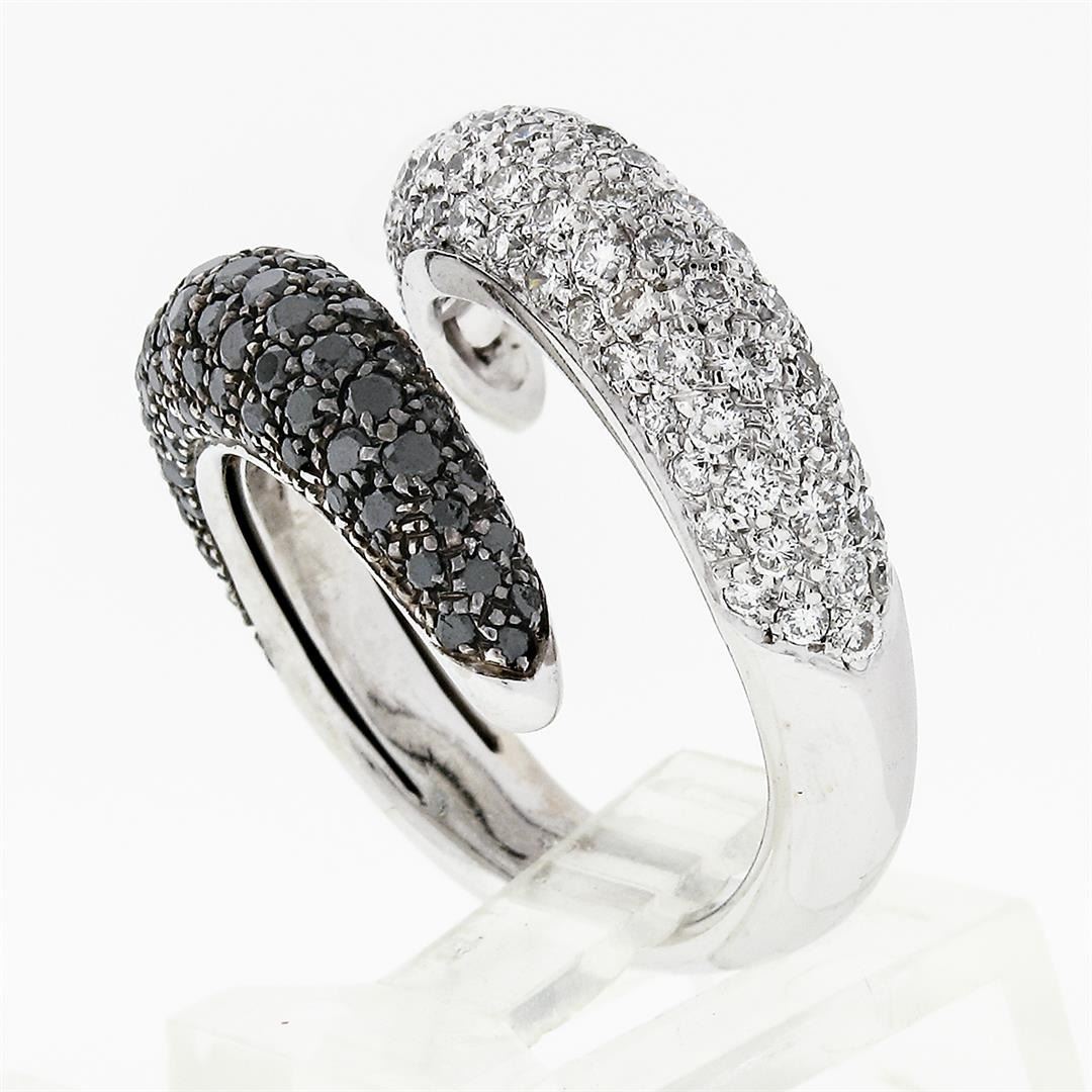 A solid 18k white gold wrap band ring, with 88 round brilliant cut natural diamonds (F - VS2/SI1 ; 0.90ctw). and 88 round brilliant cut natural diamonds (Fancy Black Color ; 0.90ctw). The ring is size 9.0, weighs a total of 12.71 grams, and measures 14.2mm wide.
