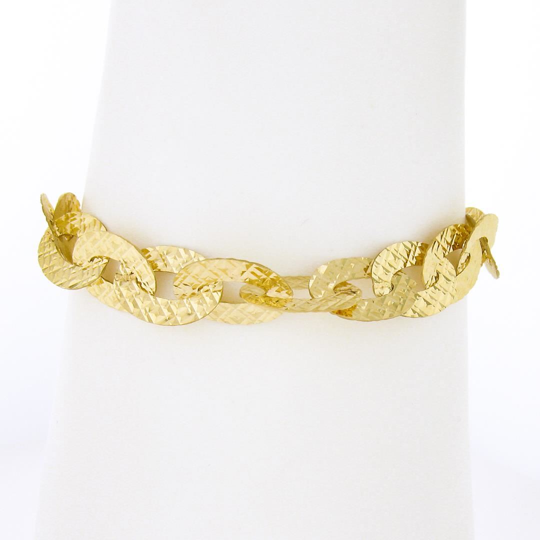 A solid 18k yellow gold oval link bracelet. It weighs a total of 9.71 grams, measures 10mm wide, and measures adjustable at 7, 7.25 & 7.5 inches in length.